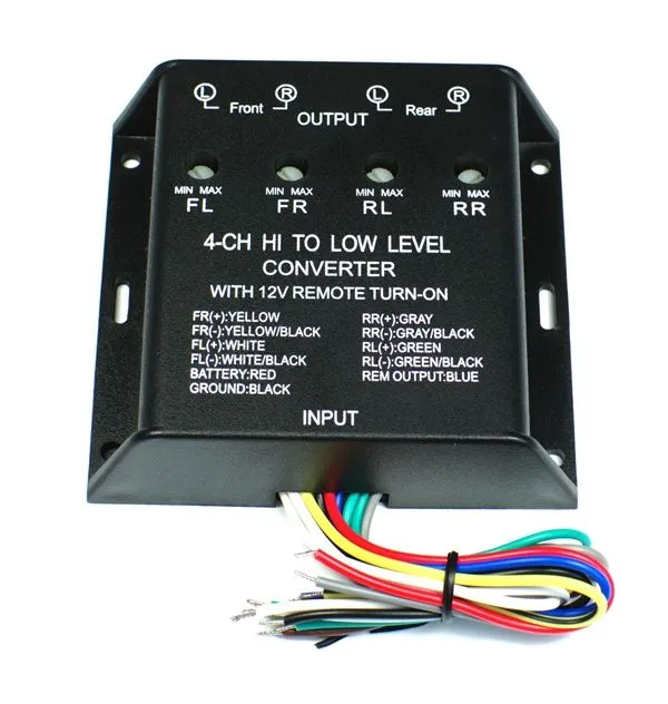 Автомобильный конвертер преобразует сигнал высокого уровня в сигнал низкого уровня, имеет регулируемый диапазон входной чувствительности, автоматическое включение/выключение.
